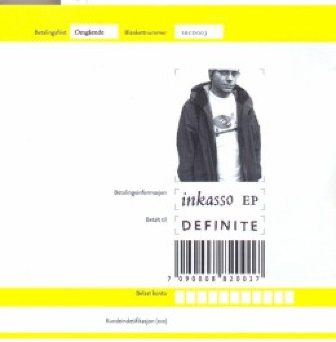 Vi har noen få av Definite sin 2003 EP «Inkasso» på vinyl. Det er en fet EP og dessverre det eneste Definite slapp på vinyl – og noe av det siste han slapp overhode. Med på plata er Elling fra Gatas og Apollo. Coveret er littegrann rynkete men i plast. Fet skive.